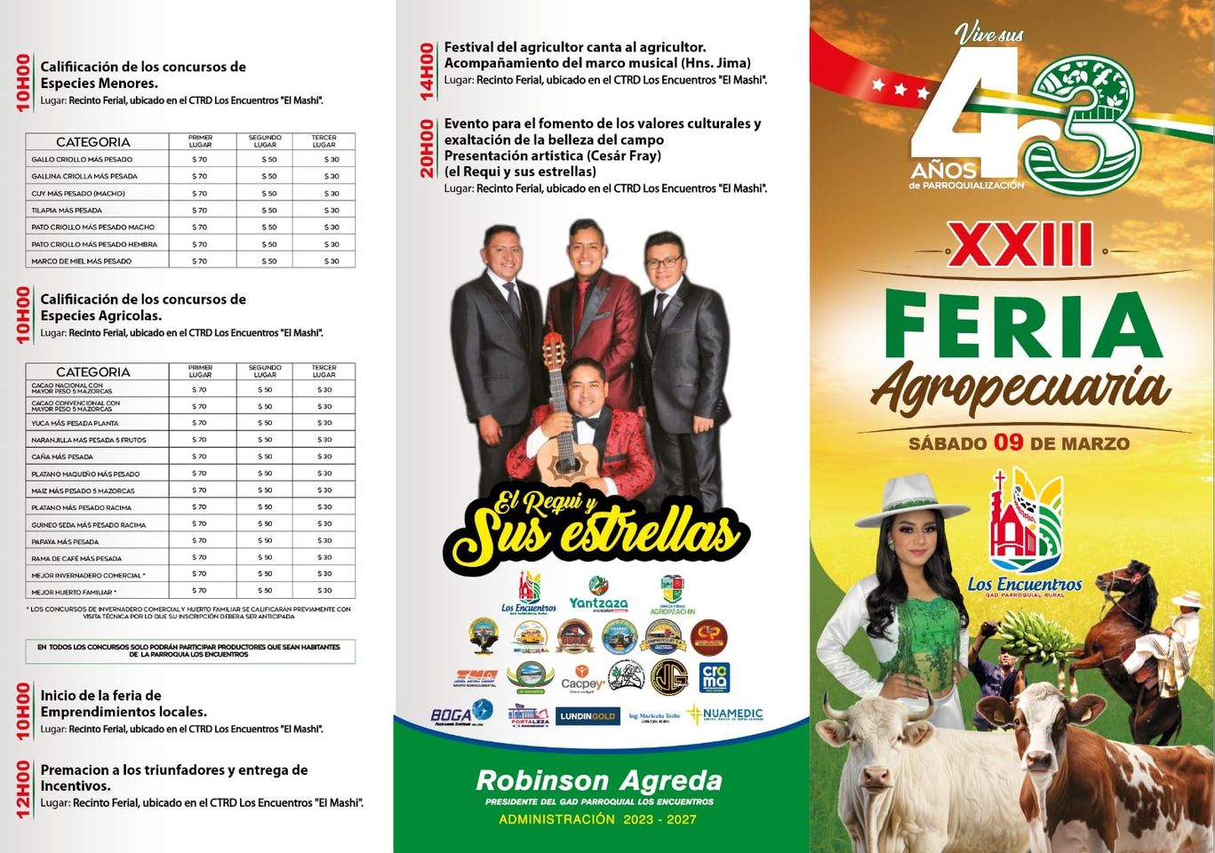 El GAD de Los Encuentros se complace en anunciar la celebración de la XXIII Feria Agropecuaria Los Encuentros 2024, que tendrá lugar el sábado 9 de marzo de 2024 en el Centro Recreacional El Mashi. Este evento, que celebra la rica tradición agrícola de nuestra región, promete ser una jornada llena de diversión, aprendizaje y celebración para toda la familia.